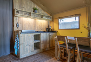 Tu lodge combina la diversión del camping con la comodidad de una casa de vacaciones. En el interior encontrarás una cálida sala de estar con detalles en madera donde podéis relajaros juntos y ver la televisión después de un día fuera. La cocina de concepto abierto tiene todo lo que necesitas para empezar el día o preparar unas bebidas por la tarde, incluyendo nevera-congelador, hervidor eléctrico y cafetera de cápsulas.