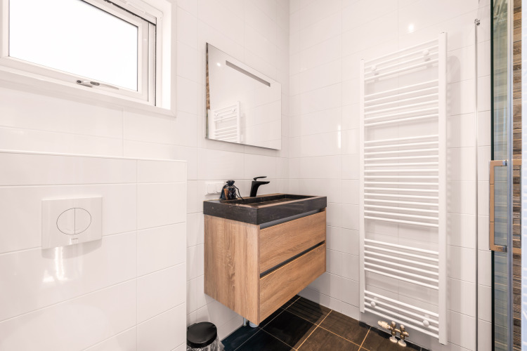 Baño Un cuarto de baño limpio y espacioso, equipado con lo necesario. Una cabina de ducha con alcachofa y grifo mezclador, un inodoro y un lavabo con espacio para guardar cosas. Se proporcionan toallas.