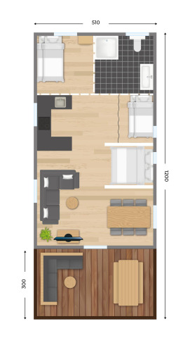 El cuarto de baño está totalmente equipado con ducha con rociador independiente, lavabo e inodoro. Puedes disfrutar del hermoso aire libre desde la terraza cubierta. La terraza tiene un sofá y una mesa de picnic donde puedes sentarte con toda la familia. ¡Un lugar encantador en los días de verano!