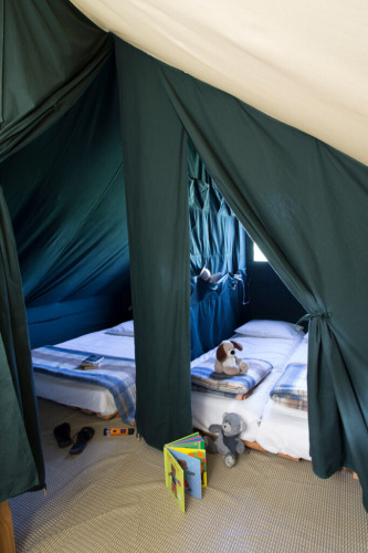 Arriba, bajo la lona, hay plazas para dormir con 1 colchón doble (140 × 200) y 3 colchones individuales (60 × 200).