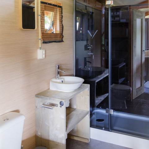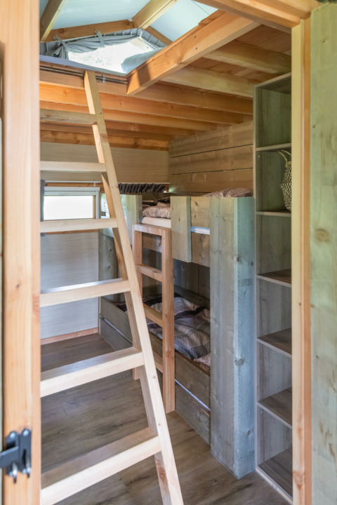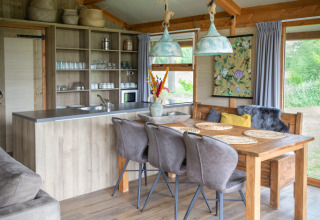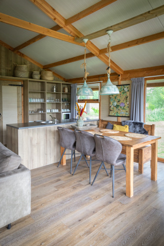 Los lodges cuentan con amplias y deliciosas áreas de estar y están decorados de manera agradable. Espacioso salón con zona de comedor y sala de estar con estufa. Cocina totalmente equipada con pequeño horno de 23 lt, lavavajillas, nevera con congelador, microondas, placa de inducción, cafetera Nespresso, cafetera de filtro (no2), hervidor de agua, suficientes utensilios de cocina, vajilla y cubiertos. Un dormitorio con camas boxspring y suficiente espacio de armario, otro dormitorio con una litera para dos personas y la posibilidad de una cama adicional. En el altillo para dormir hay dos camas. Televisión con NL 1,2,3 y radio. El lodge también cuenta con una estufa de pellets. Baño espacioso con amplia cabina de ducha, lavabo e inodoro.