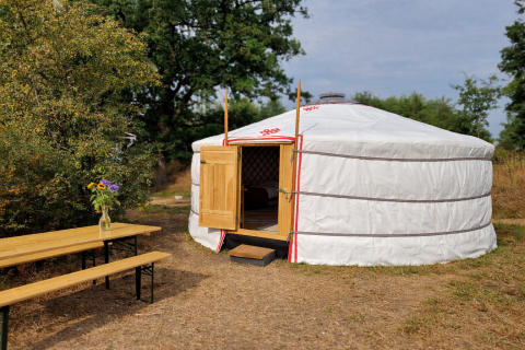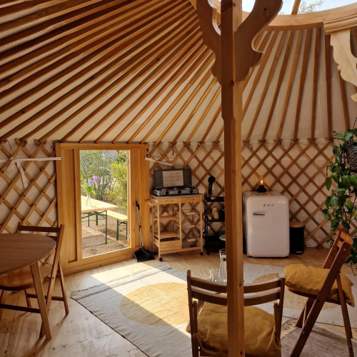 Esta yurta totalmente nueva está equipada con una cama king size y dos camas individuales, estufa de leña, mini cocina, nevera, hervidor de agua, baño privado y su propia mesa de picnic al aire libre. La yurta está situada en un nuevo terreno del camping con instalaciones como un parque infantil y un huerto. Muy cerca puedes aparcar gratis.