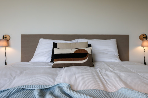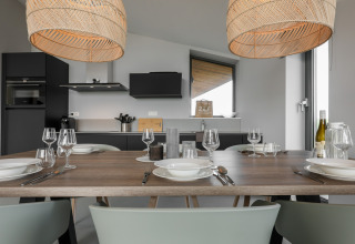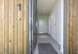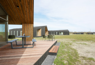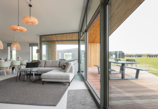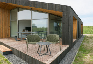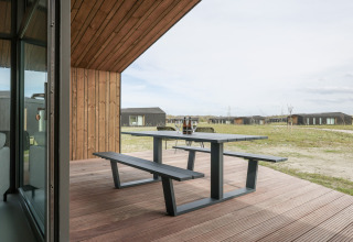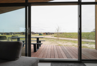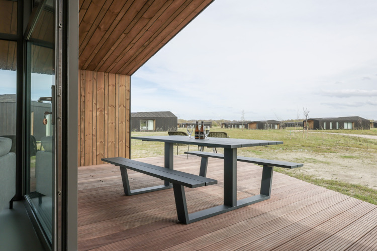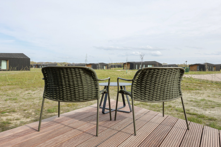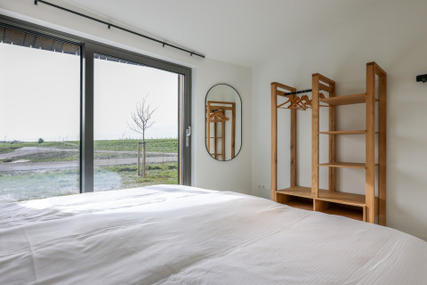 Desliza las puertas que dan a tu terraza privada y contempla los amplios paisajes a tu alrededor. Es un lugar perfecto para mañanas relajadas con café, bebidas al atardecer o para planear las aventuras del día siguiente. Como el parque es de reciente construcción y está enfocado en la sostenibilidad, el ambiente es tranquilo, verde y discreto, justo lo que quieres para una escapada apacible.