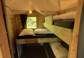 • Acogedora cabaña de madera en Huttopia Gorges du Verdon, rodeada de vegetación y con montañas al fondo.