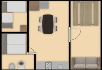 • Cabaña de madera con porche en Camping de Lyon, Auvergne-Rhône-Alpes, Francia, rodeada de vegetación.