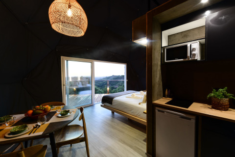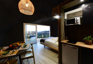 La Family Dome ofrece una experiencia de alojamiento sostenible donde la naturaleza y la comodidad se fusionan. La estructura blanca en forma de cúpula se siente luminosa y espaciosa, creando una armonía con el entorno. En el interior, encontrarás un amplio dormitorio principal con una cama queen-size y unas vistas espectaculares al valle y al mar. Para los niños hay un acogedor loft privado con dos camas individuales, inteligentemente situado sobre la cocina abierta y el baño. La cocina completamente equipada dispone de nevera, microondas y cafetera de cápsulas. Aire acondicionado, toallas, ropa de cama y productos de baño están incluidos. En el exterior hay un gran balcón de 25 m² que conecta el interior y el exterior sin esfuerzo. El alojamiento es apto para cuatro personas, se aceptan mascotas y puedes aparcar directamente junto a la dome.