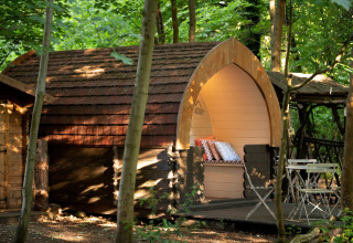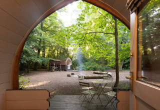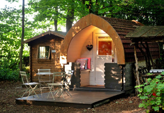 Afuera, puedes relajarte en tu propia terraza con asientos, perfecta para el café de la mañana o una copa por la tarde bajo los árboles. Tienes un baño privado, una ducha con agua caliente y un lavabo, así que no necesitarás compartir instalaciones con otros huéspedes. Por dentro, el pod es sencillo pero bien equipado, con electricidad, calefacción y una nevera para mantener frescos tus aperitivos y bebidas.