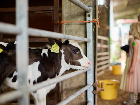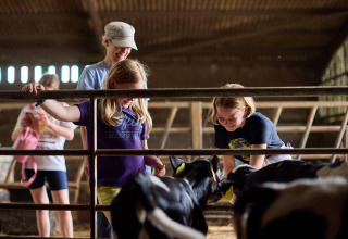 Excelente estancia en la granja, los niños están haciendo un recorrido por la granja viendo y alimentando a las vacas y los terneros.