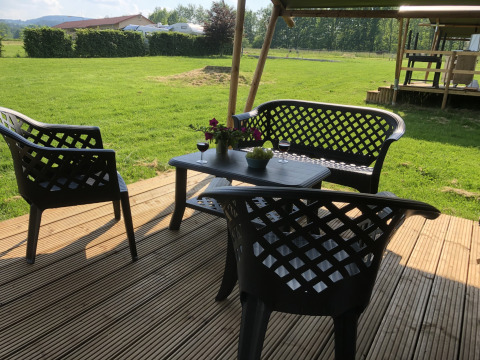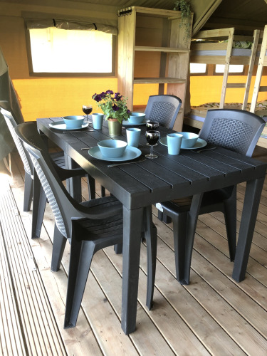 La tienda safari es una tienda safari de lujo con capacidad para 6 personas, ¡un alojamiento ideal para unas vacaciones en familia o en grupo! Con una superficie de 40m2. Comed juntos en la gran mesa con sillas, abrid completamente la parte delantera de la tienda y disfrutad de las vistas y del aire fresco. Prepara las comidas en la cocina totalmente equipada y relájate al final del día en uno de los lujosos sillones o en uno de los 2 dormitorios. En un dormitorio encontrarás una gran cama doble, y en el otro 2 literas. Con 2 metros de largo, las camas son adecuadas tanto para niños como para adultos.