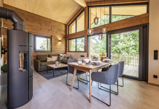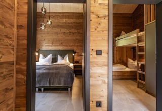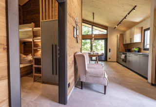 À l'intérieur, vous trouverez deux chambres accueillantes, dont une équipée d’un lit superposé amusant que les enfants vont adorer. Le salon lumineux et ouvert constitue le cœur du chalet. Après une journée en plein air, allumez le poêle à bois, blottissez-vous sur le canapé et profitez de ces soirées lentes et cosy ensemble.