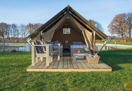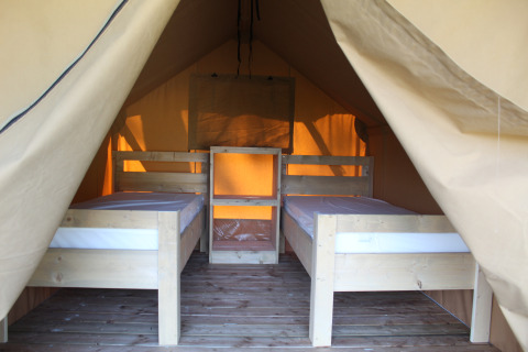 Cette tente safari chaleureuse est située au cœur de la nature et offre un séjour relaxant avec une véritable sensation de plein air. À l'intérieur, vous trouverez un espace nuit douillet avec deux lits une personne, équipés de couettes et d'oreillers. Pratiquement agencée et axée sur le confort, c'est un endroit agréable pour passer la nuit en toute tranquillité. La tente ne possède pas ses propres sanitaires, vous utiliserez donc les installations sanitaires communes à proximité, accessibles à pied. Cela contribue à une expérience de camping authentique, tout en conservant le confort grâce à l'aménagement soigné et à l'emplacement abrité.