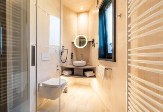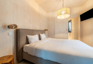 À l’intérieur, vous trouverez un espace de vie lumineux et confortable avec tout le nécessaire. Le lodge dispose d’une chambre double avec salle de bain attenante comprenant une douche, des toilettes et un lavabo, offrant ainsi toute l’intimité et le confort souhaités. L’espace salon et salle à manger, ouvert et aéré, dégage une atmosphère chaleureuse – parfait pour des matins tranquilles, de longues discussions ou une soirée détendue après une journée au grand air.
