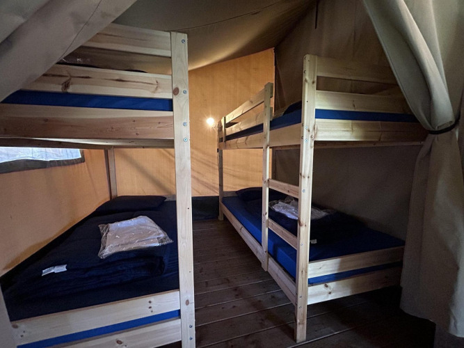 Bergerven Lodge 6 est une tente de glamping adaptée à 6 personnes. Retourne à la nature et expérimente la sensation du camping mais avec le luxe d'une tente meublée ! La tente glamping dispose de deux chambres, l'une avec deux lits superposés et l'autre avec un lit double. Il y a aussi une kitchenette avec bouilloire et machine à café filtre et beaucoup d'espace de rangement pour toutes tes affaires. Tu peux prendre ton dîner dans ta tente ou à l'extérieur sur ta propre terrasse au set de jardin. Il n'y a pas de sanitaires dans la tente glamping, mais tu peux utiliser le bloc sanitaire du parc de vacances. Tu peux utiliser le Wifi gratuit dans la tente de glamping.