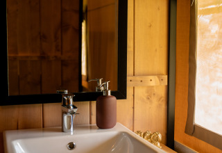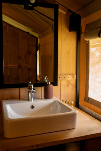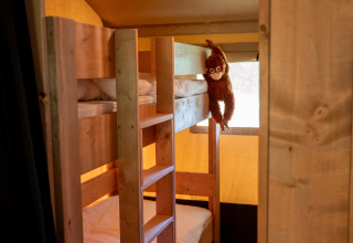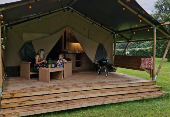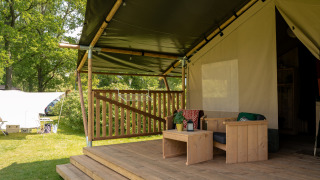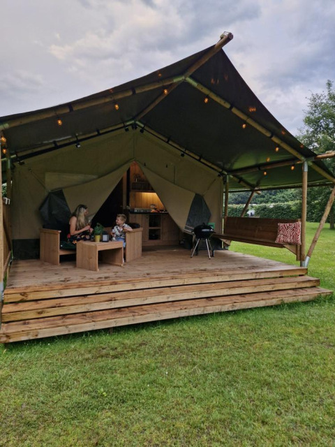 Profitez d'une expérience glamping dans cette spacieuse tente safari, où luxe et nature se rencontrent. Une véranda couverte avec salon de jardin et vue sur le lac invite à la détente, tandis qu'un barbecue facilite la cuisine en plein air. La cuisine entièrement équipée comprend une cuisinière à 4 feux, une machine à café Dolce Gusto, une bouilloire, un réfrigérateur, des assiettes et des couverts. À l'intérieur, deux cabines de couchage offrent un lit double et un lit superposé, avec couvertures et oreillers inclus. La salle de bain privée est équipée d'une douche, de toilettes et d'un lavabo, et un séchoir à linge apporte un confort supplémentaire. Une table à manger avec chaises complète le tout.