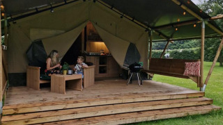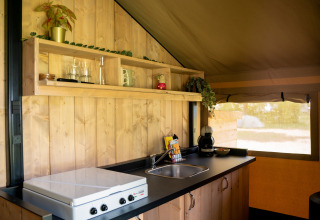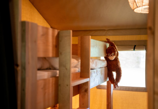 Vivez le grand air ultime dans cette spacieuse safaritent, où des touches de bois et une façade enroulable laissent entrer la nature sans compromettre le confort. Profitez de la véranda avec auvent, parfaite pour un café matinal ou une soirée sous les étoiles. La cuisine entièrement aménagée facilite la préparation des repas, avec une cuisinière à gaz quatre feux, un réfrigérateur et une cafetière qui fournit aussi de l'eau chaude. Détendez-vous dans la salle de bain privative avec douche, toilettes et lavabo, puis glissez-vous dans votre lit confortable dans l'une des deux cabines de couchage. L'une comprend un lit double et l'autre deux lits superposés, tous équipés d'oreillers et de couvertures. Cette safaritent combine facilité, confort et aventure pour une expérience glamping inoubliable.