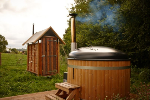 **Avec bain à remous Ton bain à remous chauffé au bois est à usage exclusif pendant ton séjour et se trouve à côté ou près de ta cachette en toile. Parfait pour se détendre sous les étoiles ou se relaxer pendant la journée.