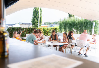 • Soirée au Huttopia Lac d’Aiguebelette avec food trucks, guirlandes lumineuses et clients en terrasse boisée.