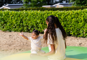 • Enfant jouant sur une aire de jeux en sable et bois dans un parc de vacances proposant du glamping.