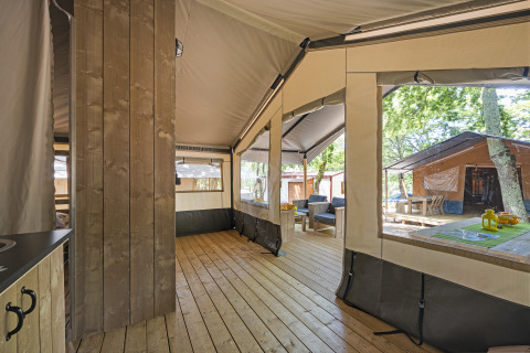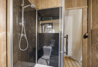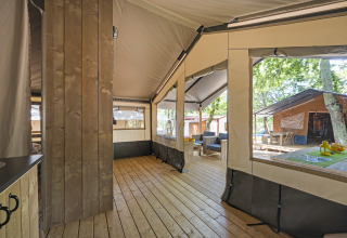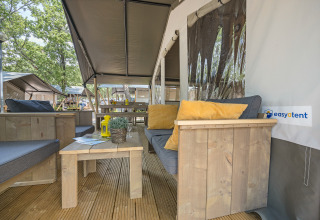À l'extérieur, vous profitez d'une grande véranda en bois couverte avec salon de jardin, un endroit idéal pour se détendre en plein air. Grâce à la toile de tente enroulable, vous reliez facilement l'intérieur à l'extérieur, créant ainsi un espace de vie supplémentaire. Ici, vous profitez du meilleur du glamping : séjour confortable en pleine nature, avec toutes les commodités à portée de main.