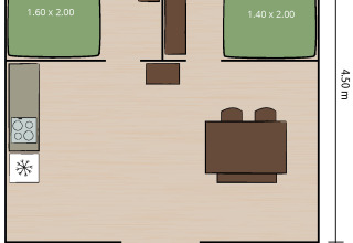 À l’intérieur, vous trouverez une cuisine confortable avec un réfrigérateur avec compartiment congélateur, une table, des chaises et une armoire pour toutes vos tenues de vacances. Cette luxueuse tente safari dispose de cinq couchages standards : 1x lit double (1,60 x 2,00), 1x lit double (1,40 x 2,00) et 1x lit simple (0,80 x 2,00). Les couettes et oreillers sont bien sûr toujours inclus. Les draps-housses, housses de couette et taies d’oreiller sont à apporter soi-même ou peuvent être facilement loués. Vous pouvez également louer le pack bébé, composé d’un lit bébé sécurisé et d’une chaise haute solide.
