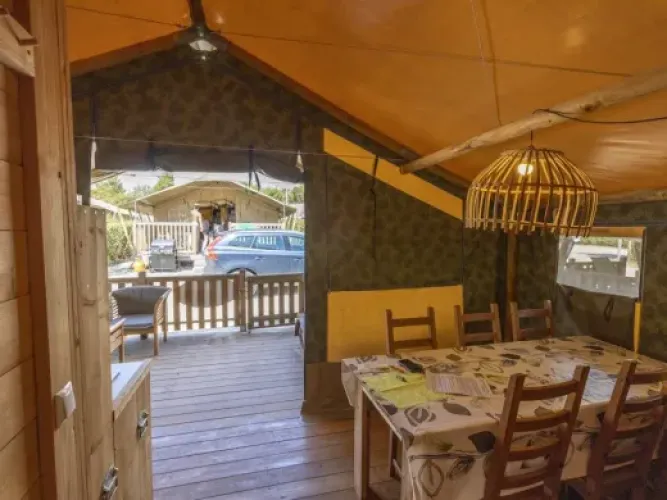 Camper avec confort dans la spacieuse Safaritent Sorella + sanitaires + climatisation