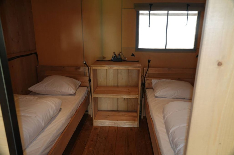 La Safaritent Bella Lodge avec sanitaires privés et climatisation offre tout pour des vacances sans souci. Commencez la journée par une douche rafraîchissante dans votre propre salle de bain, savourez un repas convivial dans la cuisine chaleureuse et dormez à merveille dans des lits confortables. C’est un logement spacieux où vous pourrez vraiment vous détendre. Vous n'avez plus à vous soucier de rien. Que vous lisiez un livre avec un verre de vin à la main ou profitiez d’être ensemble dehors : la véranda en bois avec salon de jardin et grand auvent rend chaque moment spécial. Grâce à la toile de tente flexible, vous pouvez créer l’ambiance et l’espace que vous souhaitez, pour vivre la nature croate de près.