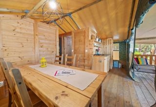 Glamping avec le confort d’un hôtel et la liberté de la vie en plein air. La Safaritent Sunset (env. 34 m²) est aménagée avec ambiance et située au calme, avec salle de bains privée (douche, toilettes, lavabo) et climatisation pour des nuits fraîches. À l’intérieur : une cuisine complète, une table à manger, des chaises et des rangements. Vous dormez dans trois pièces distinctes : 1× lit double (160×200) et 2× alcôves avec deux lits superposés (soit 4 lits au total).