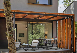 Votre Bungalow Pinus (environ 50 m²) est moderne, lumineux et entièrement équipé. Avec deux chambres séparées et un salon confortable, il y a beaucoup d’espace pour les familles ou un petit groupe d’amis. La climatisation maintient une agréable fraîcheur pendant les journées chaudes d’été ; bien sûr, le WiFi est inclus pour partager instantanément vos moments de vacances. La terrasse couverte et meublée est sûrement l’endroit où vous passerez le plus de temps : lire un livre à l’ombre, prendre de longs petits-déjeuners ou savourer un apéritif en soirée en écoutant le chant des cigales.