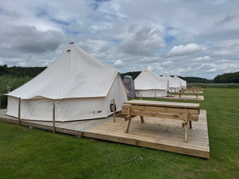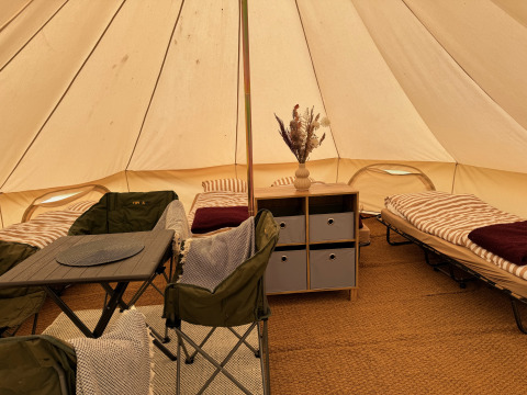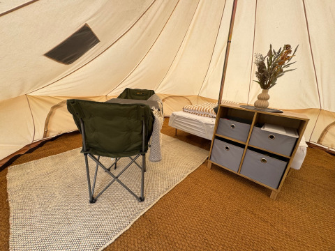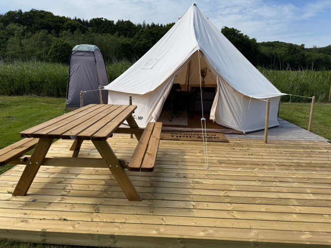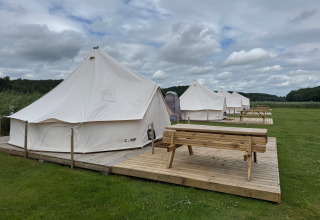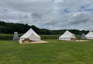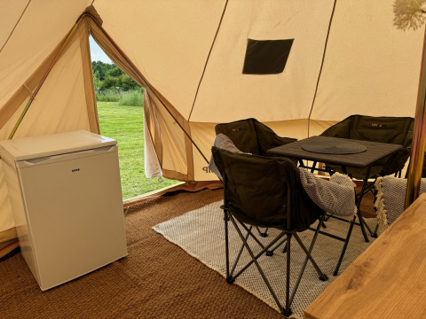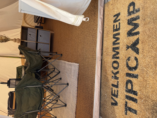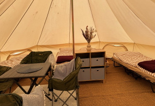 Cette Tipi Tent douillette convient pour 4 personnes et dispose d’un plancher en bois ainsi que d’une terrasse couverte avec table et chaises. À l’intérieur, vous trouverez des lits confortables avec couettes et oreillers, ainsi que tout ce qu’il vous faut pour cuisiner vous-même : réfrigérateur, vaisselle, couverts, casseroles et ustensiles de cuisine. À l’extérieur, un barbecue Weber au charbon de bois est prêt à être utilisé. Une base simple mais complète pour un séjour détente en pleine nature.