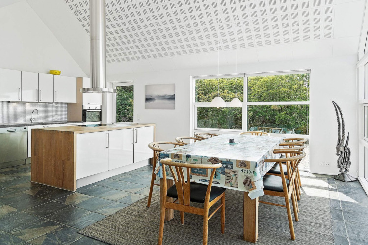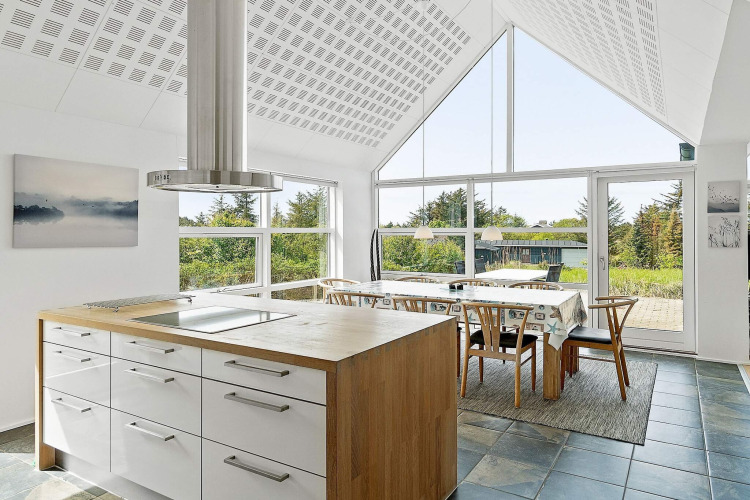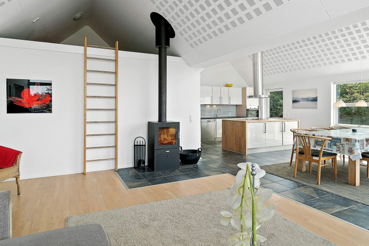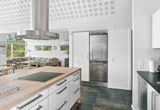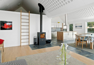 Le cœur de la maison, c’est la spacieuse cuisine ouverte sur le salon. La cuisine est bien équipée, vous permettant de cuisiner ensemble tout en discutant avec le reste du groupe dans le salon lumineux. Grâce aux grandes fenêtres et au plafond haut et ouvert, l’ensemble de l’espace est lumineux et accueillant. Lors des soirées plus fraîches, vous pouvez allumer le poêle à bois, prendre un verre, jouer à des jeux autour de la table ou vous détendre dans le canapé.