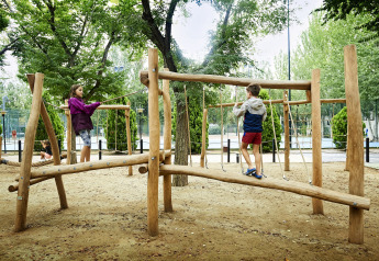 • Enfant sur une balançoire dans une aire de jeux forestière au Huttopia Parque de Doñana, Andalousie, Espagne.
