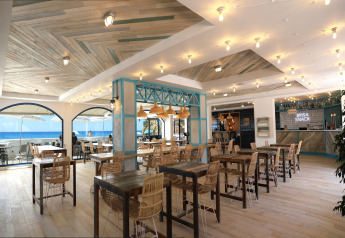 • Piscine avec transats et parasols en paille au TAIGA Almeria Playa, parc de vacances, Andalousie, Espagne.