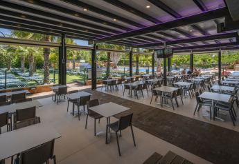 • Scène extérieure au Camping Vilanova Park en Catalogne, Espagne, avec des gens, des tables et des palmiers.