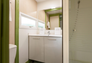 À l’intérieur, le bungalow dispose de deux chambres et peut accueillir jusqu’à 5 personnes : idéal pour une petite famille ou un groupe d’amis. Le séjour lumineux est un endroit parfait pour se détendre après une journée au soleil, et la cuisine ouverte bien équipée permet de préparer facilement un petit-déjeuner, un pique-nique pour la plage ou un dîner simple tous ensemble. La salle de bain avec douche complète l’aménagement pratique et convivial.