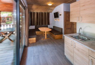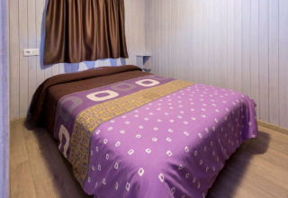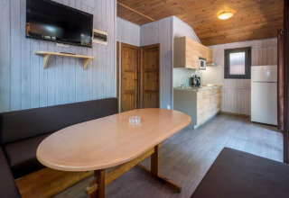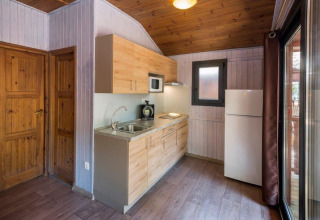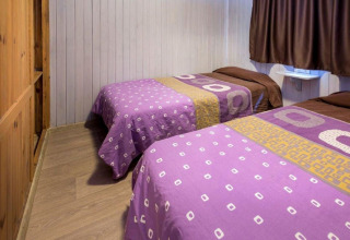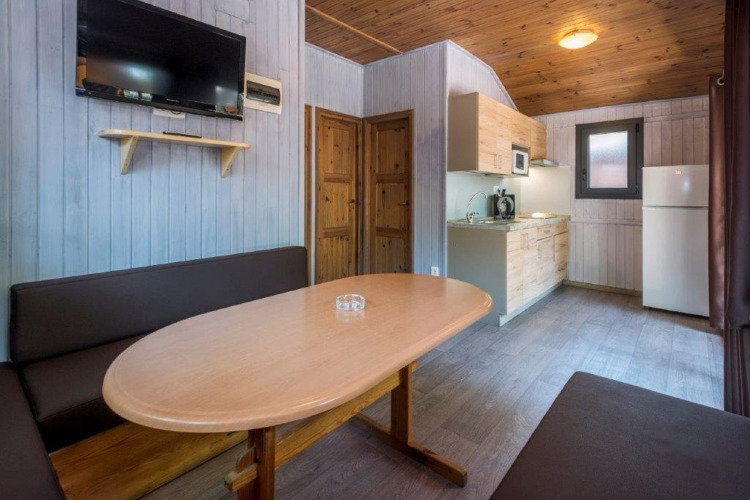 À l’intérieur, le chalet est intelligemment agencé pour accueillir jusqu’à 6 personnes. Une chambre dispose d’un lit double confortable et une autre chambre comprend deux lits simples (ou, dans certains chalets, deux chambres séparées avec un lit simple chacune). Dans le salon se trouve un canapé-lit double, parfait pour un invité supplémentaire ou pour se détendre ensemble après une journée au soleil.