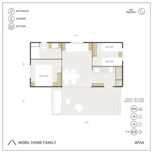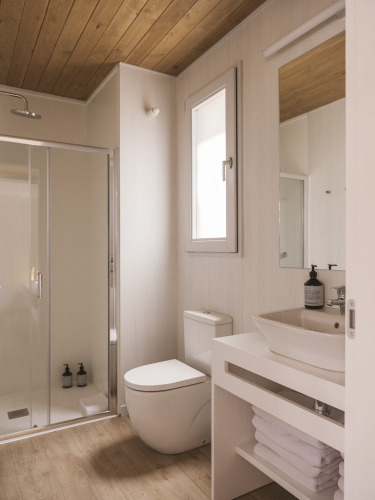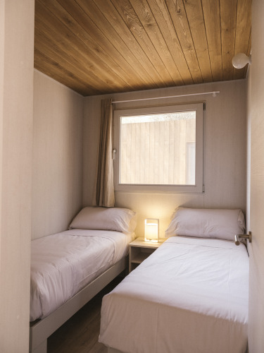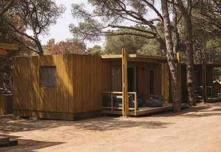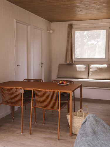 La Mobil Home Family Wood est conçue pour les familles et les groupes d'amis et combine confort et style dans un cadre chaleureux. Adaptée pour un maximum de 4 personnes, elle dispose de deux chambres (une chambre double et une avec deux lits simples), d'une cuisine entièrement équipée et d'une salle de bain complète. La terrasse avec véranda meublée est parfaite pour se détendre à l'ombre. Les chiens sont les bienvenus (en option et moyennant des frais supplémentaires).