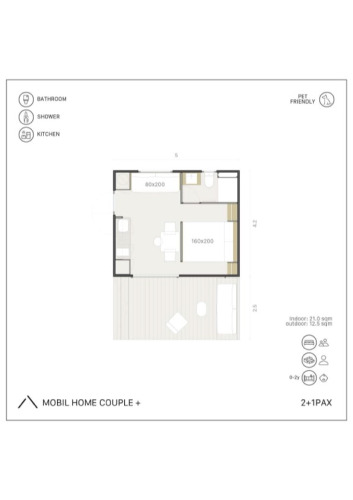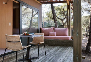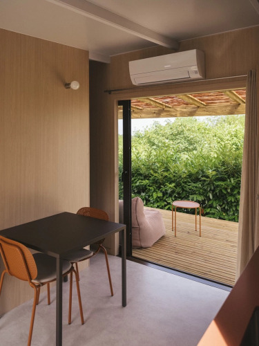 Il s'agit d'un Mobile Home avec un intérieur spacieux et soigné, climatisation et une chambre avec un lit double. Équipé d'une cuisine avec plaque de cuisson vitrocéramique, micro-ondes, lave-vaisselle, réfrigérateur, machine à café à capsules, ustensiles et couverts. Il y a une salle de bain avec douche, toilettes, lavabo et sèche-cheveux. Il dispose également d'une terrasse avec une véranda meublée et ombragée.