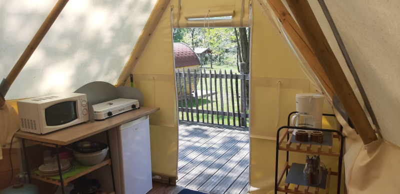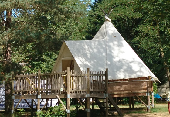 Le Tipi Lodge offre un retour à la nature avec tout le confort moderne. Cet hébergement plein de charme est monté sur pilotis à 1,50 mètre de hauteur et accessible par un escalier avec rampe. La lodge est construite en poteaux de bois et toile, posée sur un terrain herbeux proche de la rivière, et bénéficie d’une vue sur les montagnes environnantes. À l’intérieur, vous trouverez deux chambres séparées, une avec un lit double et l’autre avec un lit superposé. L’espace de vie dispose d’une cuisine simple mais complète, équipée d’un réfrigérateur-congélateur, four à micro-ondes, plaque de cuisson deux feux, cafetière et vaisselle. La Tipi Lodge ne possède pas de salle de bain privative ; vous utiliserez les sanitaires du camping. À l’extérieur, une grande terrasse de 10 m² avec mobilier de jardin, chaise longue et parasol vous attend.