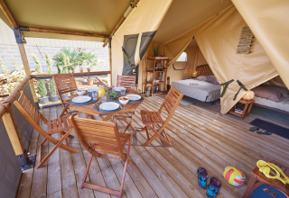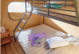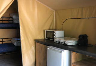 La Bali Safari Tent est une tente glamping confortable et chaleureuse de 35 m², parfaite pour des vacances en pleine nature sans sacrifier le confort. La tente est adaptée pour 4 personnes et dispose de deux chambres séparées : une avec un lit double et une avec un lit superposé, idéale pour les familles avec enfants. À l’intérieur, vous trouverez une cuisine entièrement équipée avec eau chaude courante, réfrigérateur et cuisinière à gaz. Bien que la tente ne dispose pas de sanitaires privatifs, des installations sanitaires individuelles se trouvent à proximité et sont facilement accessibles. Les journées plus fraîches sont rendues plus agréables grâce au chauffage présent. À l’extérieur, vous profiterez d’une grande terrasse privée couverte et meublée de mobilier de jardin. L’endroit idéal pour se détendre et profiter de la vie en plein air.