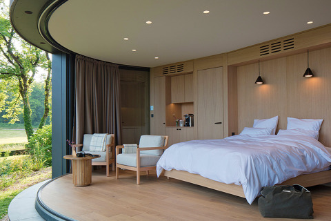 D’un simple mouvement, les parois vitrées courbes de la cabane s’ouvrent entièrement, effaçant la frontière entre l’intérieur et l’extérieur pour une expérience inédite. Vous retrouvez un véritable contact avec la nature, tout en profitant d’une vue imprenable sur l’ensemble de l’étang. Le lit queen size avec un matelas fabriqué en France, associé à des meubles haut de gamme et une finition soignée, garantit un confort optimal. La salle de bain dispose d’une douche à l’italienne. Sans quitter votre couette douillette, vous pouvez ouvrir les rideaux automatiques et admirer la vue.