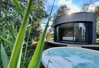 Le jacuzzi et le sauna privés sont délicieux et entièrement à l’abri des regards, dissimulés derrière des roseaux et des herbes de la pampa. Le lit double dispose d’un matelas fabriqué en France, avec des meubles et des finitions de haute qualité. Sans sortir de votre couette douillette, vous pouvez ouvrir les rideaux automatiques et profiter de la vue. La salle de bain est équipée d’une douche à l’italienne. Pour votre confort, la cabane est entièrement climatisée.