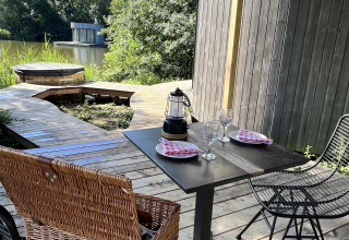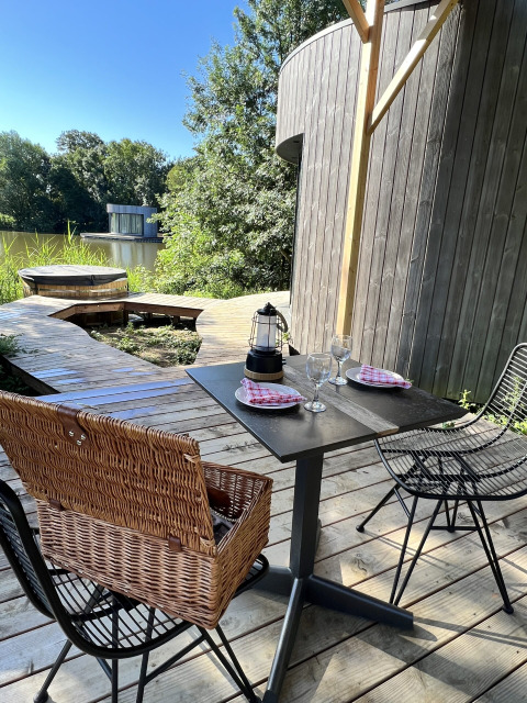 Il y a une machine à café, une bouilloire et une cave à vin avec une sélection de boissons locales à déguster. Une terrasse couverte permet de profiter de vos repas en toute tranquillité, tout au long de l’année. De plus, une barque privée est à votre disposition pour naviguer librement sur l’étang ou vous rendre à l’espace bien-être ou à la piscine.