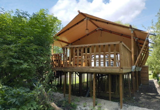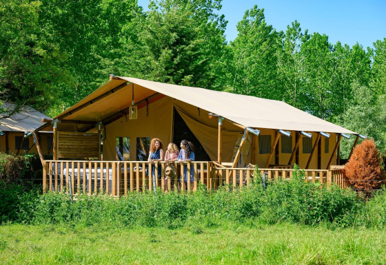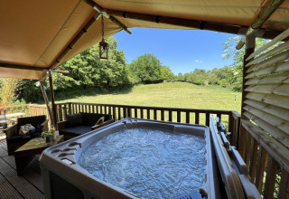 Tente safari XXL de luxe sur pilotis pour 7 personnes avec terrasse et grande jacuzzi XXL.