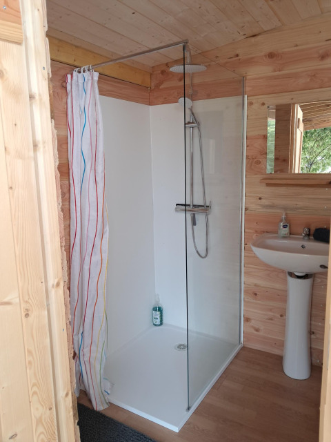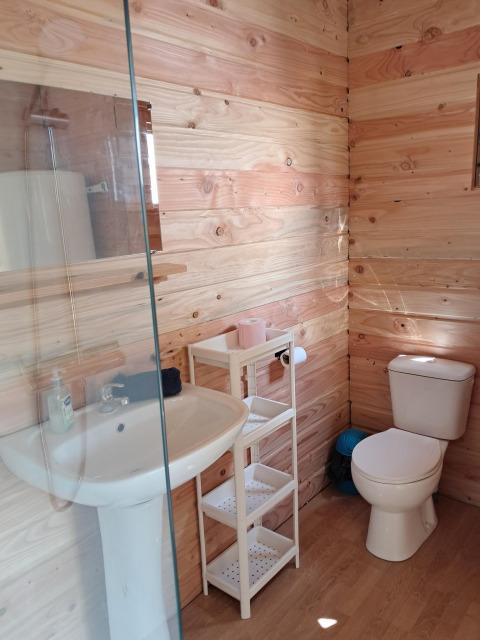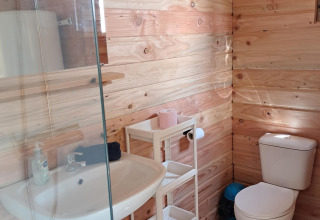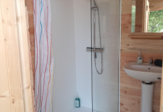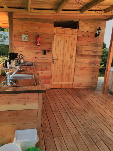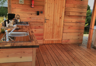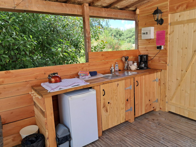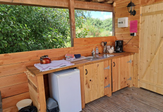Sous l’auvent se trouve une cuisine extérieure entièrement équipée avec une cuisinière à gaz 4 feux, un réfrigérateur et tout l’équipement nécessaire. Les déchets peuvent être soigneusement triés. Vous disposez également de sanitaires privés avec toilettes, lavabo et une douche à l'italienne confortable.