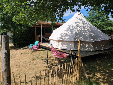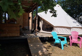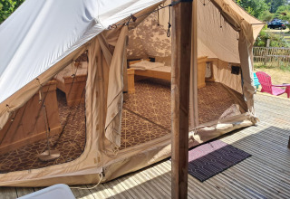 À l'extérieur, il y a une table de pique-nique en bois pour six personnes, deux fauteuils lounge confortables et un hamac solide. La tente se trouve sur un grand emplacement de 150 à 200 m², entouré de verdure.