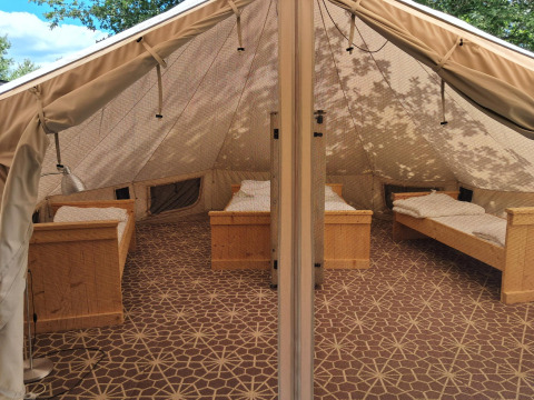 Cette Sybley APEX tent d'un diamètre de 6,2 mètres est un hébergement glamping spacieux et confortable pour 4 personnes, avec un espace supplémentaire pour un lit bébé (2 adultes, 2 enfants et 1 bébé). La tente dispose d’un grand espace de vie avec de vrais lits en bois d'épicéa massif. Le lit double mesure 160 × 210 cm et les deux lits simples 80 × 200 cm.