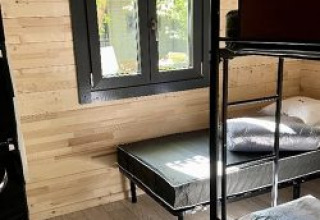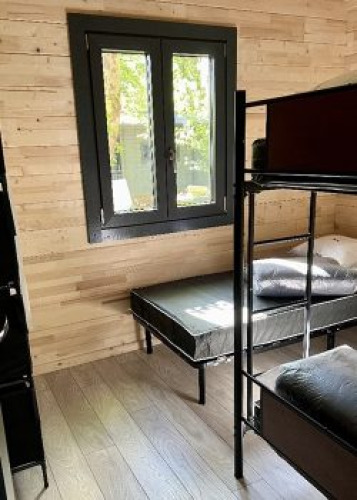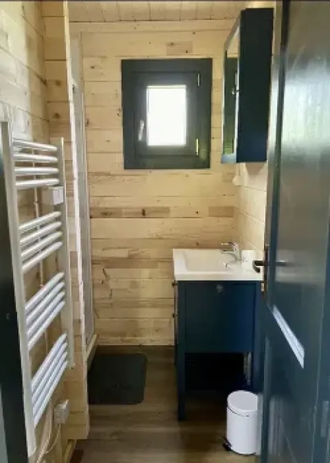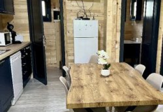 Dès que vous entrez, vous profitez de l'espace et de la lumière. La climatisation apporte une fraîcheur bienvenue qui contraste avec la chaleur extérieure. Un séjour spacieux et une cuisine entièrement équipée avec lave-vaisselle. Une salle de bain moderne. Le mobilier en bois, l'aménagement soigné et la nature environnante témoignent de l'esprit chic du glamping de l'endroit.