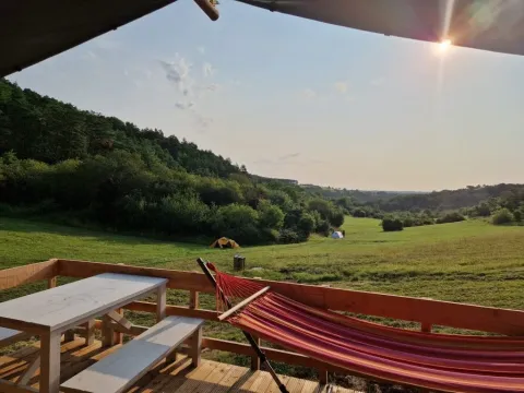 Cette safaritent est installée sur une terrasse en bois, avec vue sur la vallée, et combine la vie en plein air avec un confort supplémentaire. À l'intérieur, vous trouverez un espace de vie spacieux avec une table à manger et des bancs, ainsi que deux chambres avec des matelas boxspring confortables. Le linge de lit, les couettes et les oreillers sont inclus. La cuisine est entièrement équipée avec un grand réfrigérateur avec compartiment congélateur, une machine Nespresso et une cuisinière à gaz 4 feux. Ce qui rend cet hébergement unique, c'est que la salle de bain privée se trouve juste à côté de la tente, avec une douche, des toilettes et un lavabo.