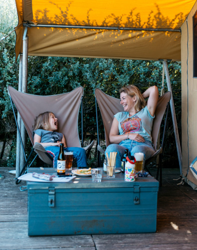 Détends-toi sur la terrasse en bois avec deux chaises pliantes, où tu pourras profiter de l'air frais et de moments agréables en famille ou entre amis. Prêt pour une expérience de camping aventureuse ? La tente Classic 4 t'attend !