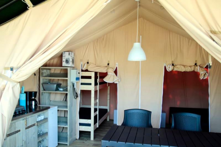 La tente safari est une tente de luxe pouvant accueillir jusqu'à 6 personnes, un hébergement idéal pour des vacances en famille ou en groupe ! Avec une surface de 40m2. Mange ensemble à la grande table avec des chaises, jette l'avant de la tente complètement ouverte et profite de la vue et de l'air frais. Prépare les repas dans la cuisine entièrement équipée et détends-toi à la fin de la journée sur l'un des luxueux fauteuils ou dans l'une des 2 chambres. Dans une chambre, tu trouveras un grand lit double, et dans l'autre, 2 lits superposés. D'une longueur de 2 mètres, les lits conviennent aussi bien aux enfants qu'aux adultes.